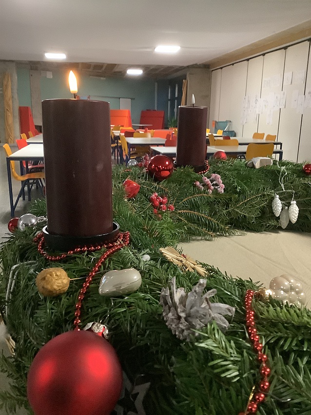 Die Adventszeit hat begonnen und in unserer Schule breitet sich langsam vorweihnachtliche Stimmung aus. Seit dem ersten Advent leuchtet bereits die erste Kerze auf dem Adventskranz, der in diesem Jahr liebevoll von Nora Hezel, Clarissa Jurschik, Franziska Noak und Emma Peñalver aus der 7a gestaltet wurde.