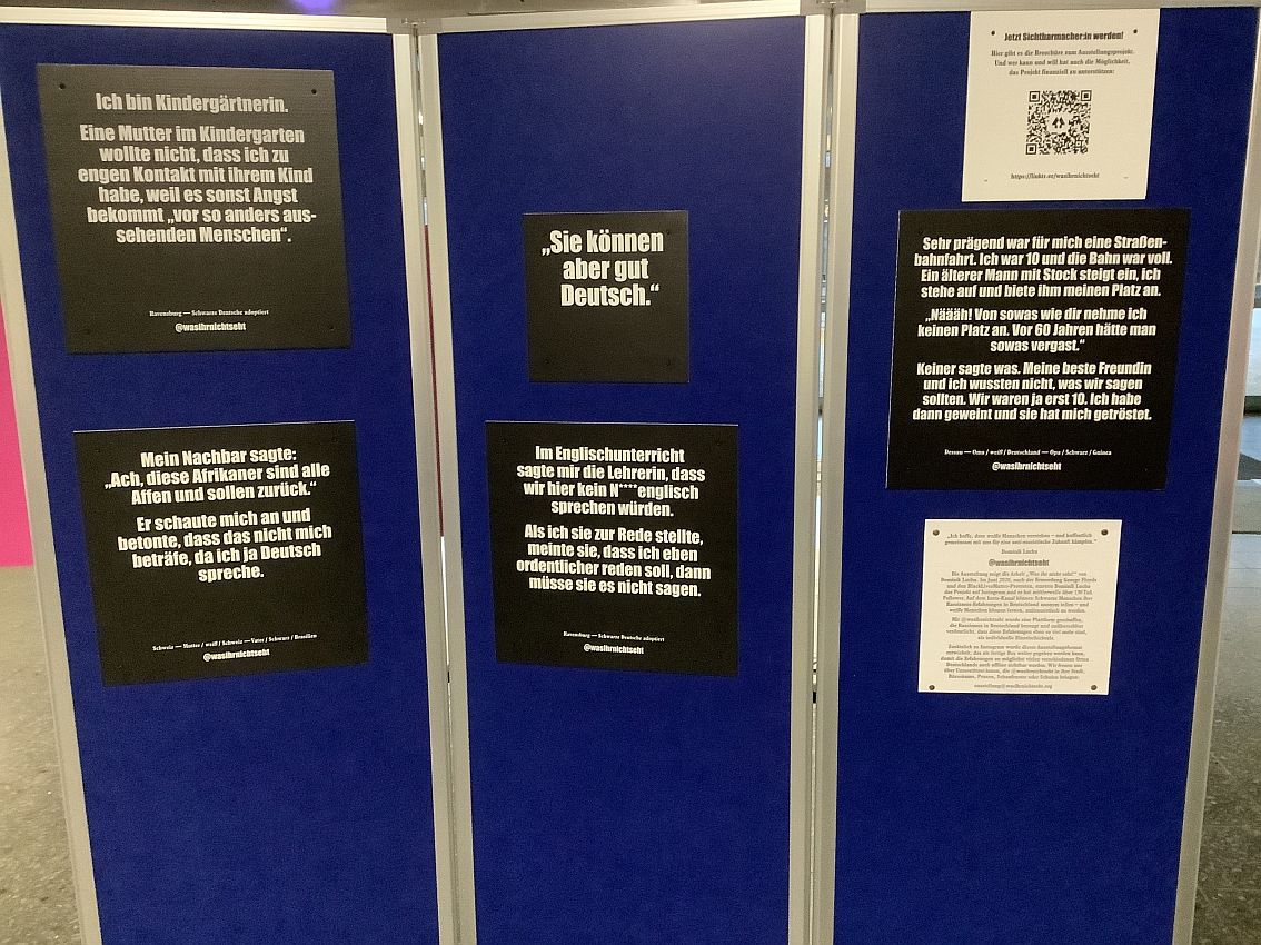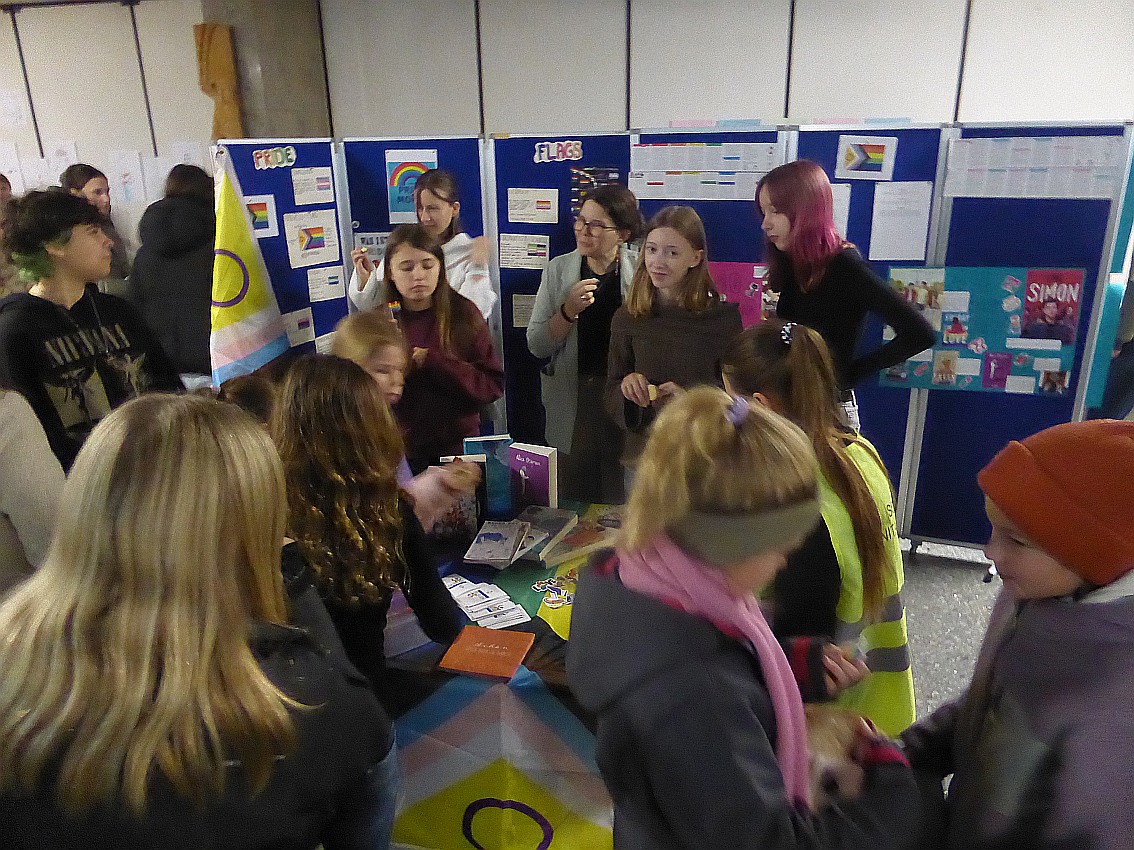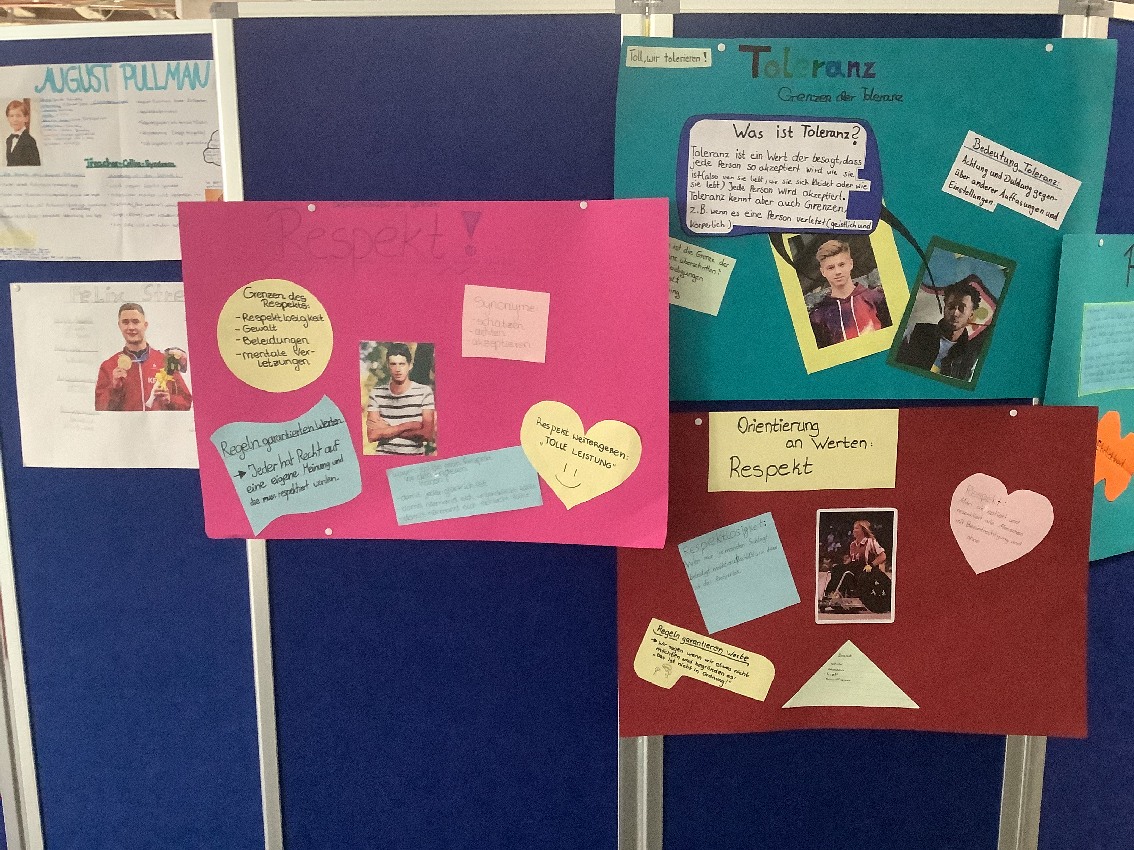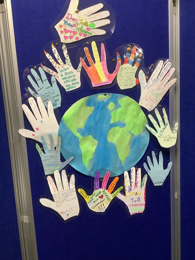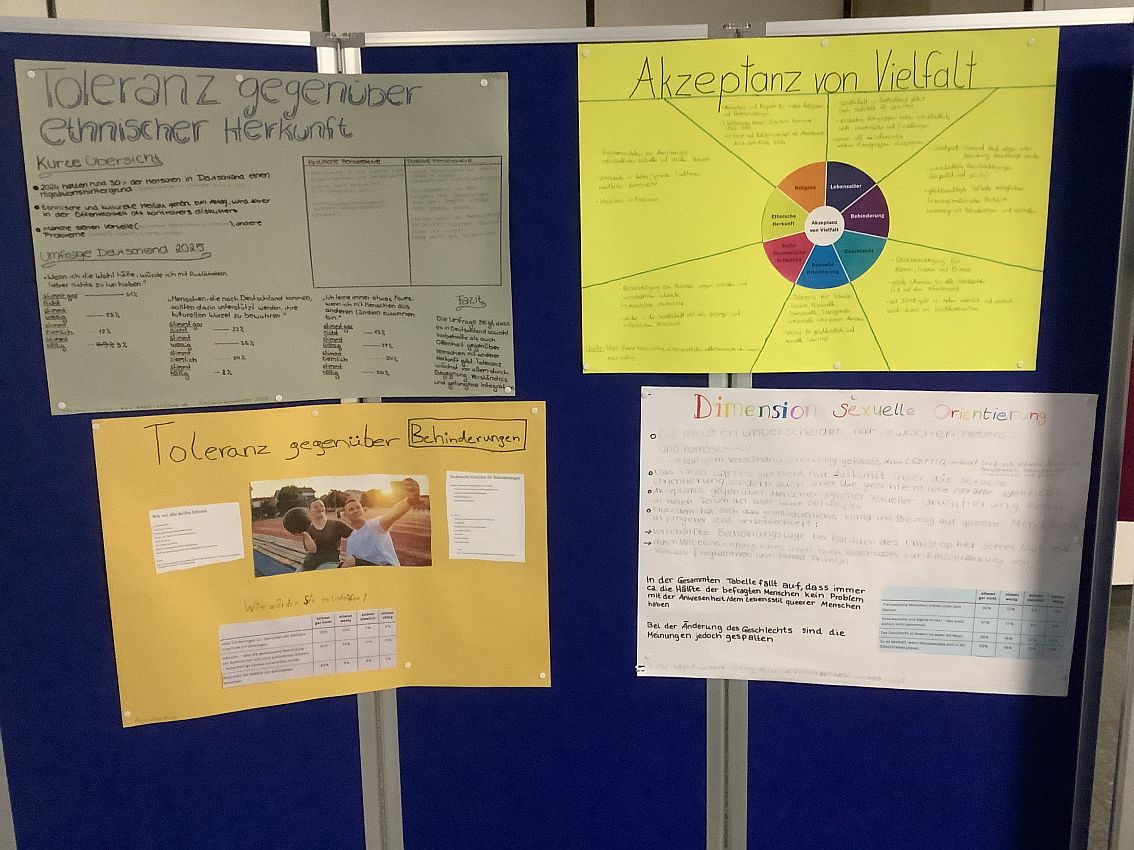 Vor 30 Jahren wurde von der UNESCO der Internationale Tag der Toleranz ausgerufen, der seither immer am 16. November jedes Jahres stattfindet. Anlässlich dieses Jubiläums organisierten verschiedene Ethik- und Religionsklassen gemeinsam mit der Vielfalt-AG eine Ausstellung, um auf die verschiedensten Arten der Diskriminierung aufmerksam zu machen, aber auch um für mehr Toleranz zu werben. In der Ausstellung werden die unterschiedlichsten Gruppen angesprochen, die Formen der Intoleranz erleben. So geht es um Vorurteile und Benachteiligung aufgrund von Hautfarbe, Behinderungen, Herkunft, Alter, Geschlecht, Religion oder sexueller Orientierung. Neben den Schülerarbeiten ist auch die Ausstellung „Wasihrnichtseht“ von Dominik Lucha zu sehen, in der alltäglicher Rassismus in Deutschland thematisiert wird. Darüber hinaus konnten sich die Schülerinnen und Schülern am Eröffnungstag an Ständen aktiv an kleineren Aktionen beteiligen. Die Ausstellung wird bis Mittwoch, den 26.11.25, zu sehen sein.