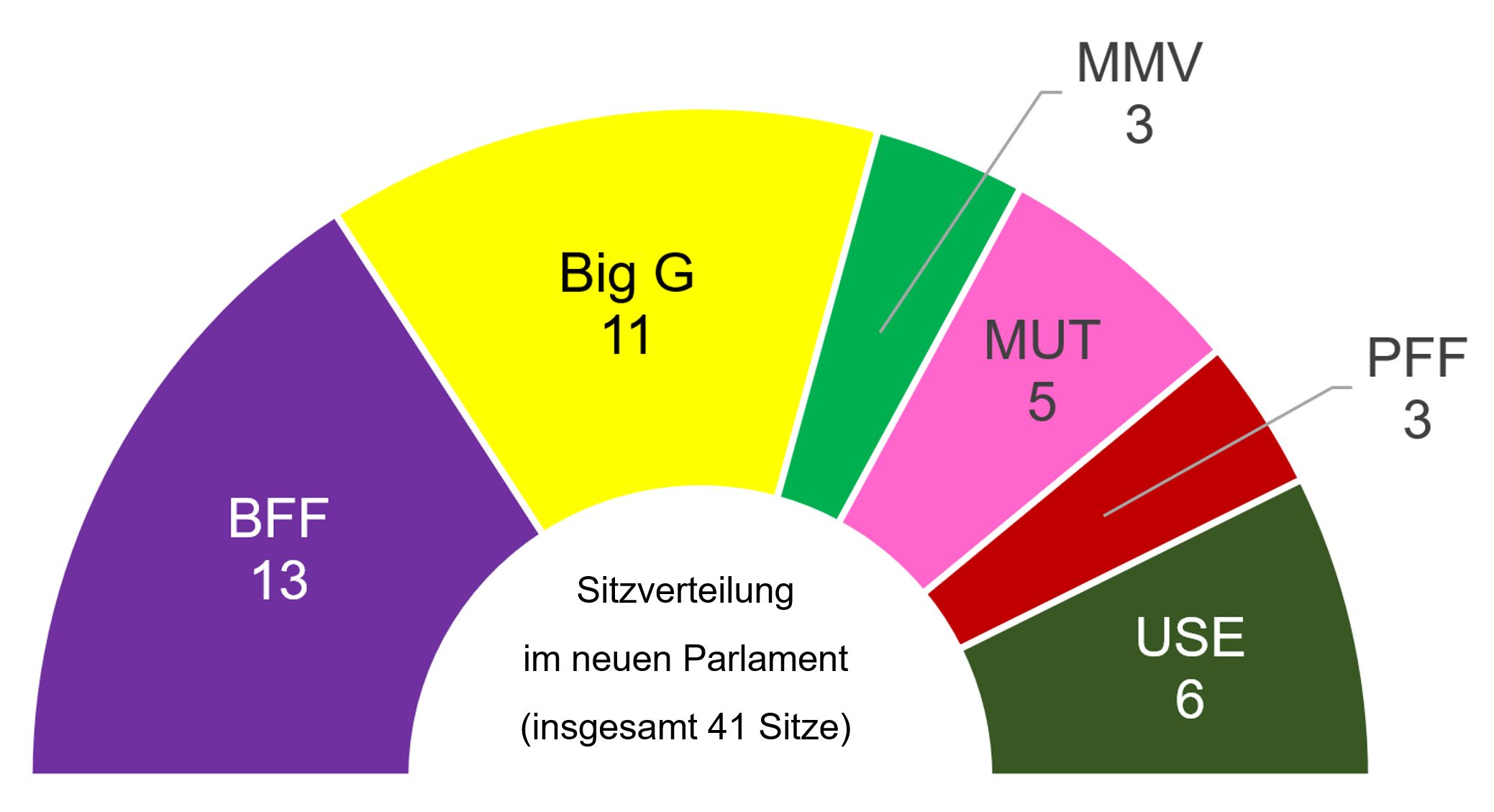 Die Wahlergebnisse im Einzelnen: BFF: 30,33 %, Big G: 27,53 %, USE: 15,24 %, MUT: 13,06 %, PFF: 7,15 %, MMV: 6,69 %.