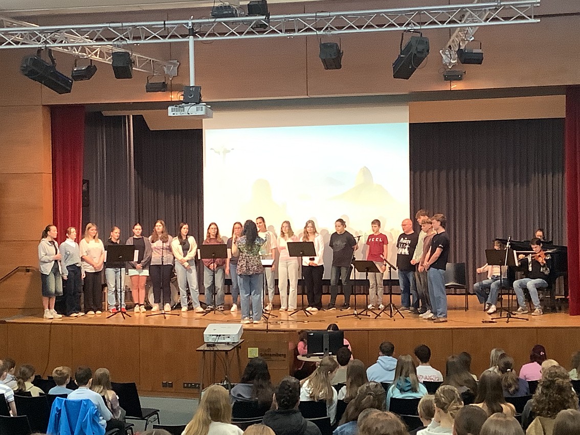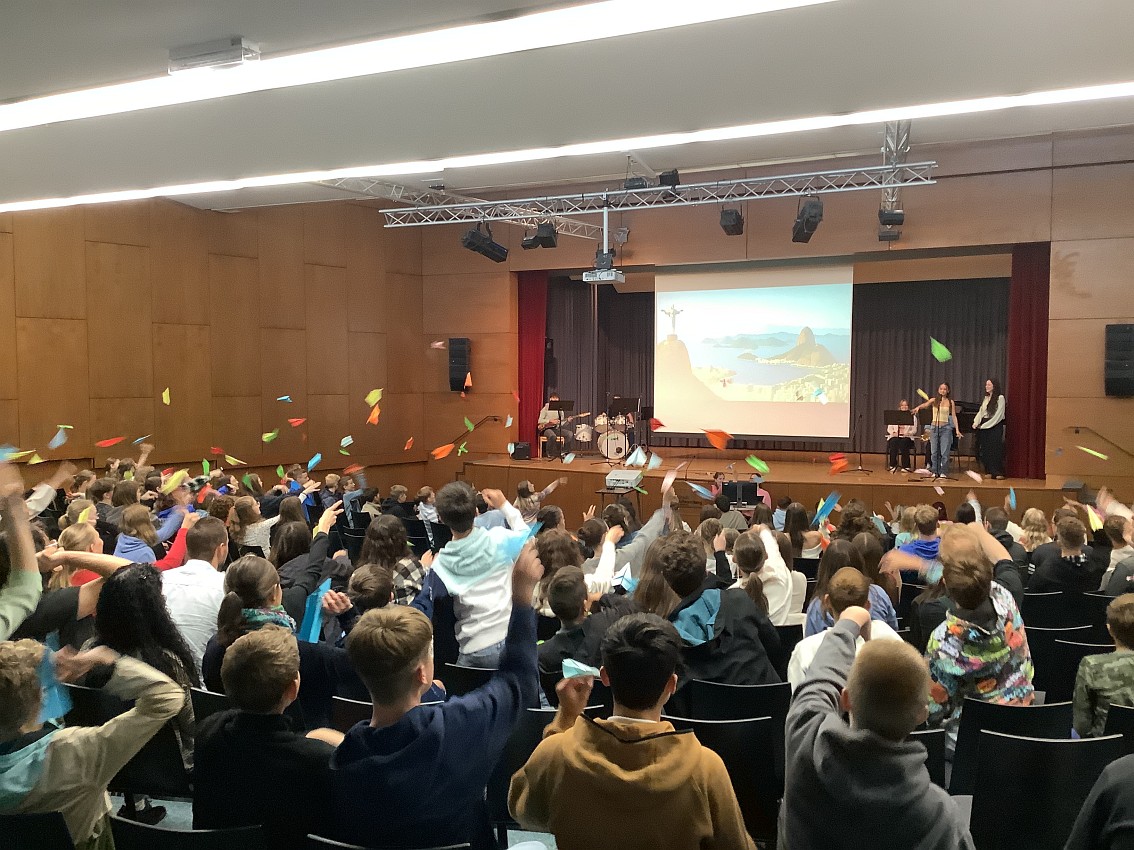 GottesdienstDer diesjährige Schuljahresendgottesdienst stand unter dem Motto „Endlich Ferien – mit Blick auf Brasilien“, symbolisiert Brasilien doch viele Sehnsüchte, die sich in der Urlaubszeit erfüllen sollen: Sonne, Strand, Farbenpracht, unberührte Natur, Lebensfreude. Dass wir auch in dieser Zeit den Segen Gottes bedürfen, darin erinnerte – der Christusstatue über Rio gleich – der Gottesdienst, der wie in den vergangenen Jahren vom Leistungskurs Religion gestaltet wurde. Hier ließen einige Lehrkräfte per Videoeinspieler die schönen, aber auch die belastenden Momente des letzten Schuljahres Revue passieren, hier hatten die Schülerinnen und Schüler die Möglichkeit, ihre Wünsche und Hoffnungen zu Papier zu bringen. Musikalisch unterstützt wurde der Gottesdienst vom Leistungskurs Musik und einem Schüler-Lehrer-Chor und am Ende hatten alle Gottesdienstbesucher die Gelegenheit, ihre Wünsche und Hoffnungen in Form eines Papierfliegers aufsteigen zu lassen, bevor sie vielleicht selbst demnächst einen Flieger besteigen werden.