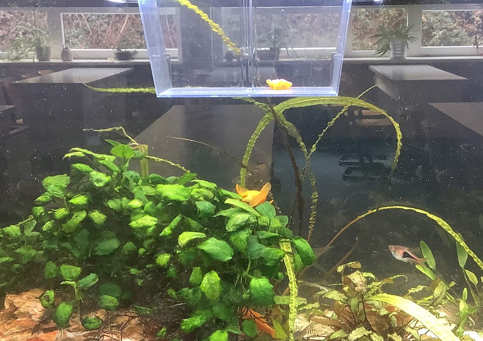 Bald Babyalarm? Im neuen Aquarium wurden orangene Eier gesichtet! Offensichtlich fühlen sich die Fische in ihrer neu gestalteten Umgebung sehr wohl. Ein Eiballen wurde in ein extra Aufzuchtbecken gebracht, da wir nicht wissen, ob sie sonst gefressen werden. Einige Eier sind unter einem Stein gut versteckt. Mal sehen, wie viele überleben!