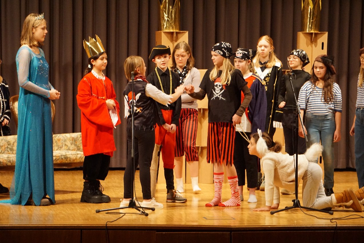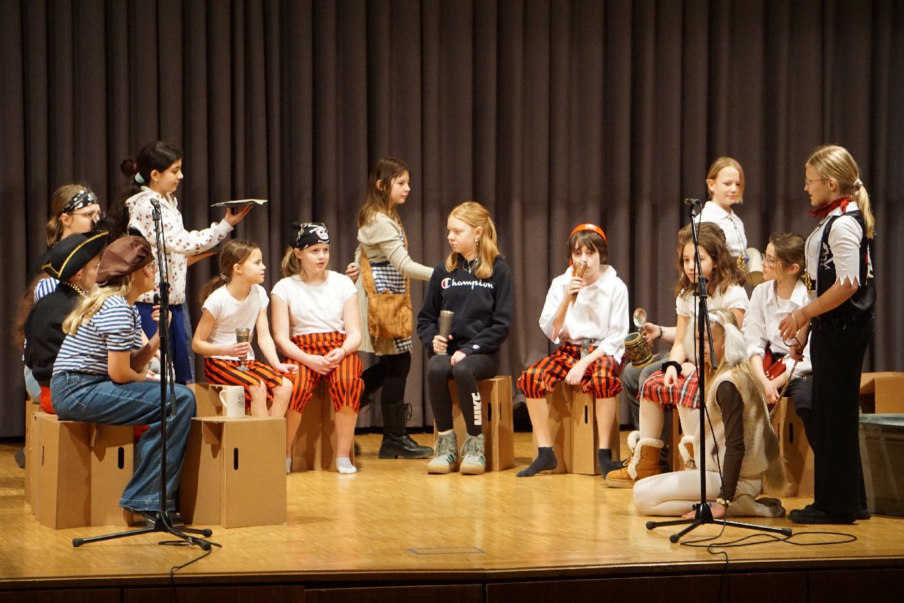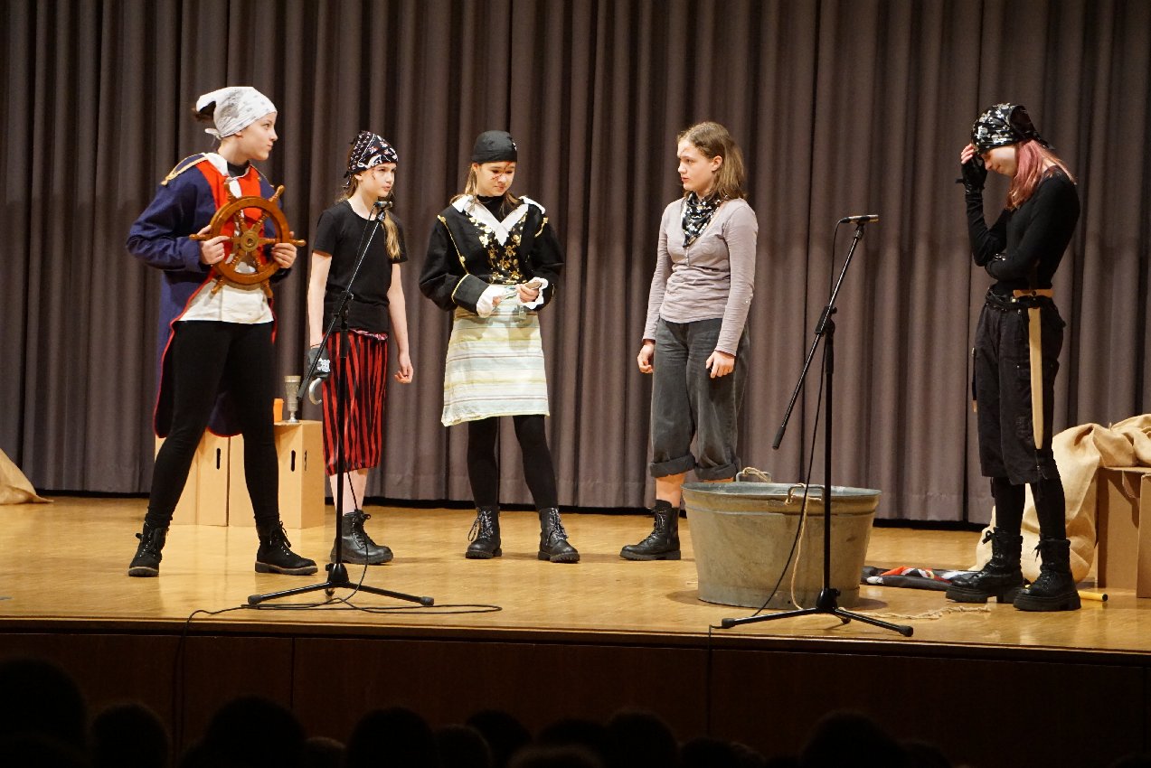 Ein Baby in einem Waschzuber mitten auf dem Meer? Was sollen die Piraten unter dem Kommando von Kapitän Klaas damit anfangen? Gegen Lösegeld verkaufen? Aber dann findet die Besatzung des Piratenschiffes das Baby doch zu süß, taufen es mit einer Suppenkelle auf den Namen Moses und ziehen es, obwohl ein Mädchen, selbst heran. Nicht wissend, in was für ein Abenteuer sie dieses Baby ziehen wird. Als es sich, inzwischen ein junges Mädchen, heimlich mit ihrer Ziege wegschleicht, wird es prompt entführt und landet ausgerechnet beim gefürchteten Piraten Olle. Der hofft, über sie an den Blutroten Blutrubin des Verderbens zu gelangen, den Heiligen Gral der Piraterie. Vor dem großen Showdown in der Halle des Königspaares müssen neue Freundschaften geschlossen, Fluchtpläne geschmiedet und Rätsel gelöst werden. Erst vor dem royalen Paar wird das Geheimnis um das Findelkind gelüftet, die Geschichte vom Blutroten Blutrubin des Verderbens erzählt und alle Verwicklungen entflechtet. Alle diese turbulenten Ereignisse nach dem Kinderbuch von Kirsten Boie brachte die Theater-AG der Unterstufe unter der Leitung von Frau Hilt und Frau Ganter mit sehr viel Spielfreude und Humor auf die Bühne. Nicht nur die schauspielerische Leistung überzeugte, auch die Kostüme waren mit viel Liebe zum Detail gestaltet worden. Hier gab es alles: Neben den Piraten Höflinge, das Königspaar, Ritter, aber auch eine Ziege, einen Raben und Bäume. Komplettiert wurde die Aufführung von der Tonstudio-AG, die die Umbaupausen musikalisch untermalte und für die Geräuschkulisse sorgte. So wurden die angereisten Grundschüler aus den umliegenden Schulen aufs Beste unterhalten, wofür sich diese bei dem Ensemble mit viel Applaus bedankten.