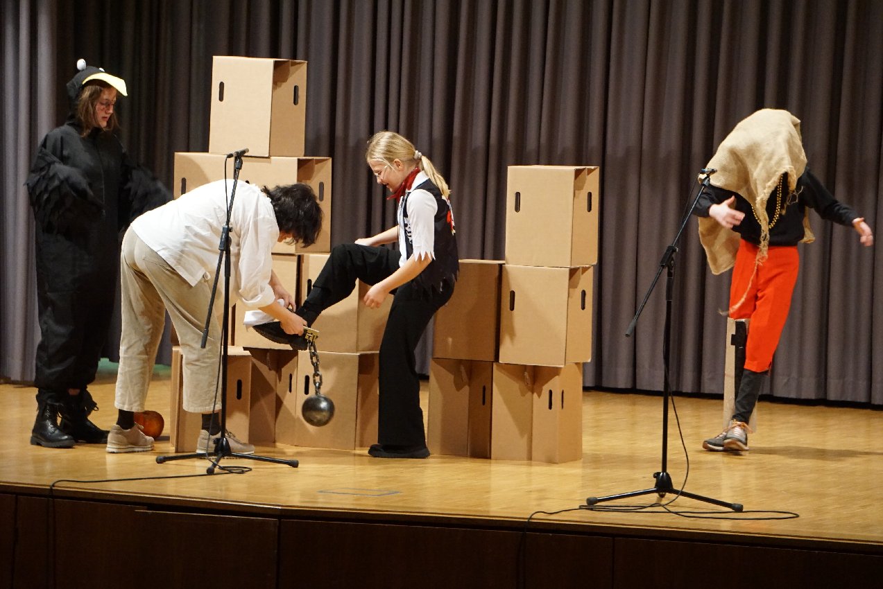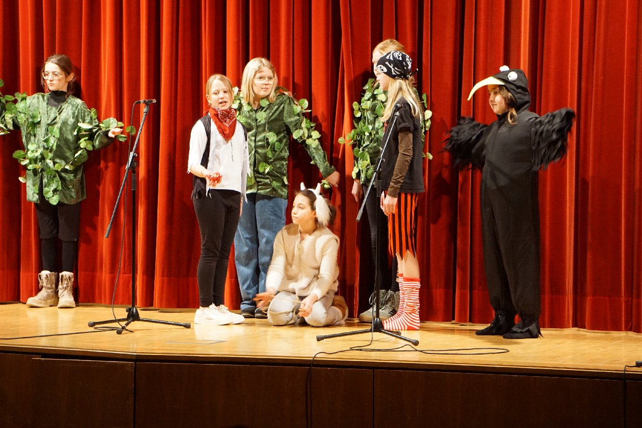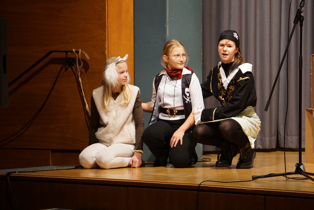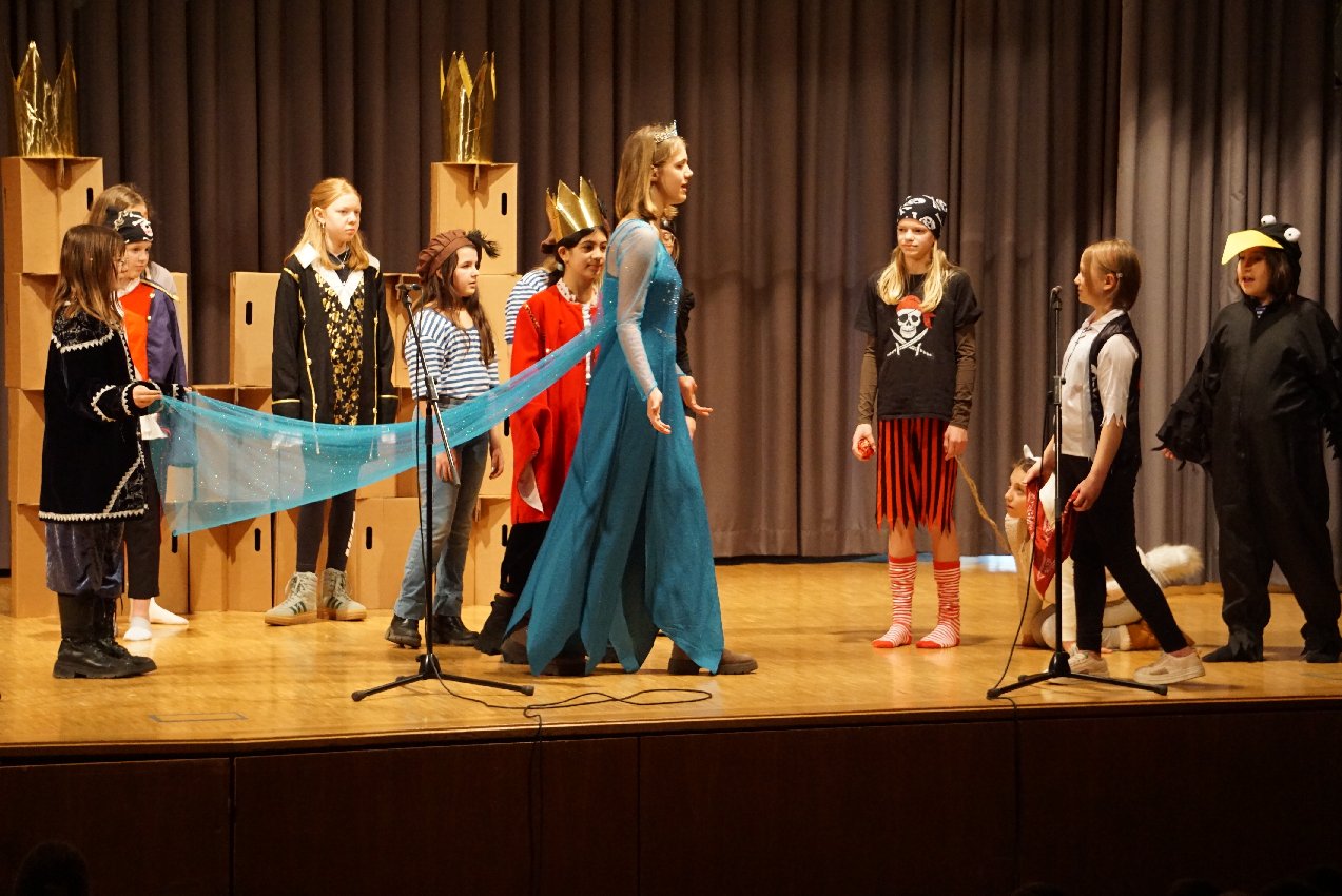 Ein Baby in einem Waschzuber mitten auf dem Meer? Was sollen die Piraten unter dem Kommando von Kapitän Klaas damit anfangen? Gegen Lösegeld verkaufen? Aber dann findet die Besatzung des Piratenschiffes das Baby doch zu süß, taufen es mit einer Suppenkelle auf den Namen Moses und ziehen es, obwohl ein Mädchen, selbst heran. Nicht wissend, in was für ein Abenteuer sie dieses Baby ziehen wird. Als es sich, inzwischen ein junges Mädchen, heimlich mit ihrer Ziege wegschleicht, wird es prompt entführt und landet ausgerechnet beim gefürchteten Piraten Olle. Der hofft, über sie an den Blutroten Blutrubin des Verderbens zu gelangen, den Heiligen Gral der Piraterie. Vor dem großen Showdown in der Halle des Königspaares müssen neue Freundschaften geschlossen, Fluchtpläne geschmiedet und Rätsel gelöst werden. Erst vor dem royalen Paar wird das Geheimnis um das Findelkind gelüftet, die Geschichte vom Blutroten Blutrubin des Verderbens erzählt und alle Verwicklungen entflechtet. Alle diese turbulenten Ereignisse nach dem Kinderbuch von Kirsten Boie brachte die Theater-AG der Unterstufe unter der Leitung von Frau Hilt und Frau Ganter mit sehr viel Spielfreude und Humor auf die Bühne. Nicht nur die schauspielerische Leistung überzeugte, auch die Kostüme waren mit viel Liebe zum Detail gestaltet worden. Hier gab es alles: Neben den Piraten Höflinge, das Königspaar, Ritter, aber auch eine Ziege, einen Raben und Bäume. Komplettiert wurde die Aufführung von der Tonstudio-AG, die die Umbaupausen musikalisch untermalte und für die Geräuschkulisse sorgte. So wurden die angereisten Grundschüler aus den umliegenden Schulen aufs Beste unterhalten, wofür sich diese bei dem Ensemble mit viel Applaus bedankten.