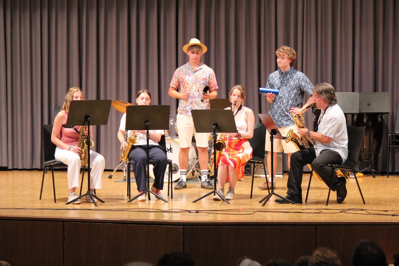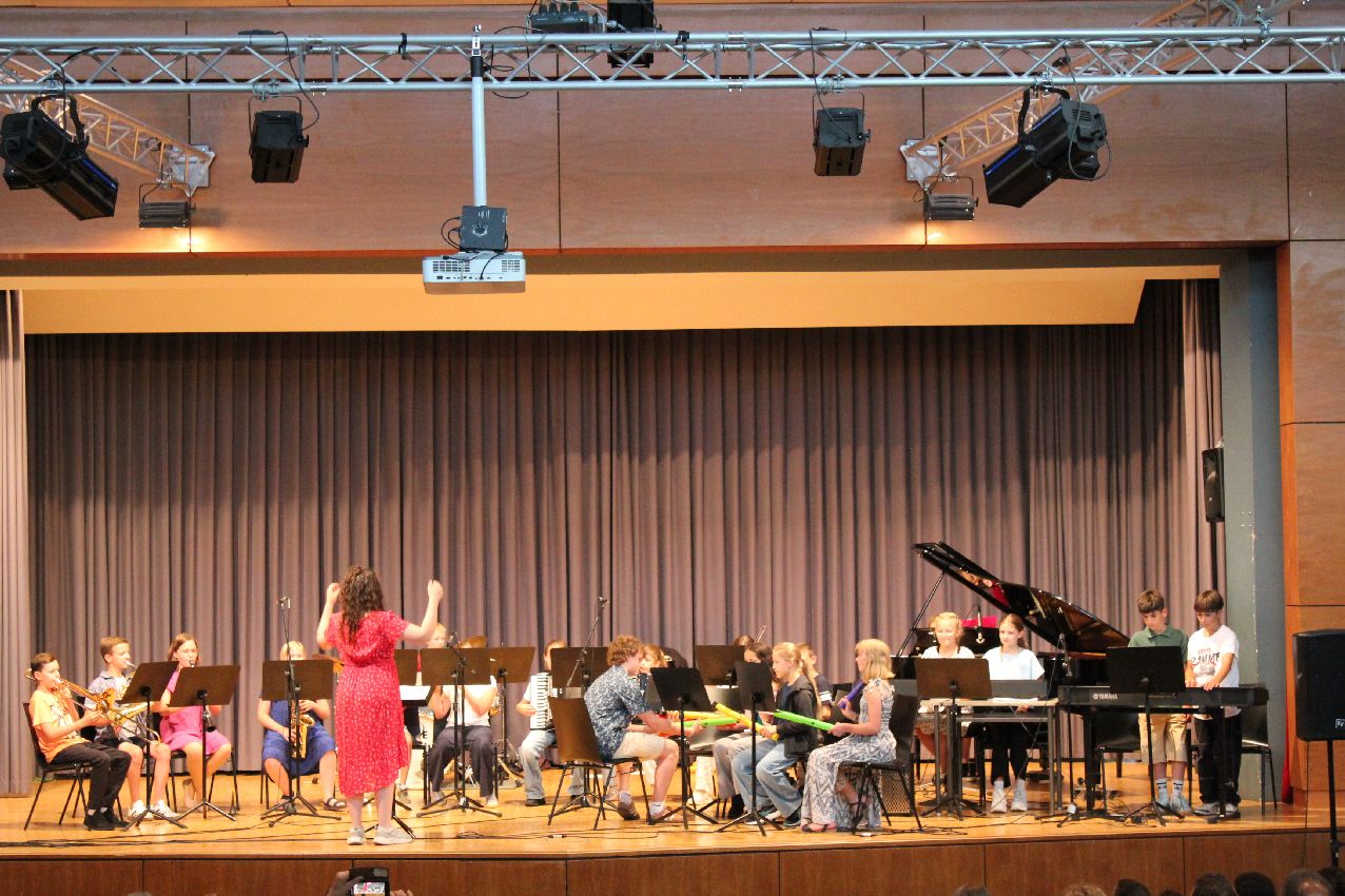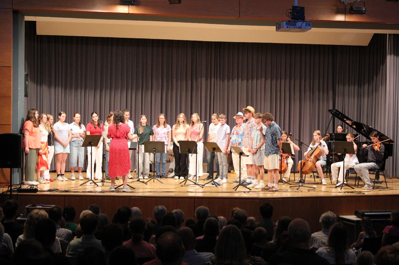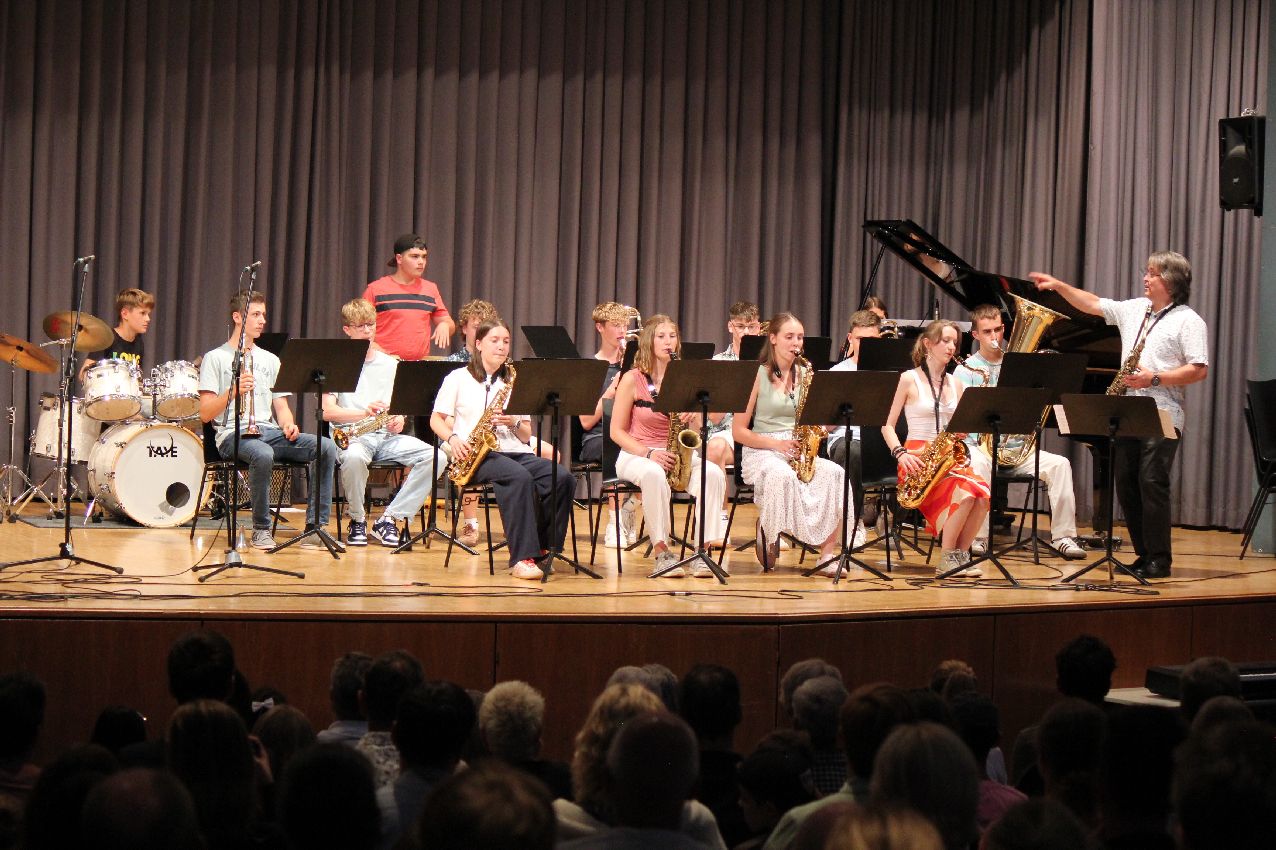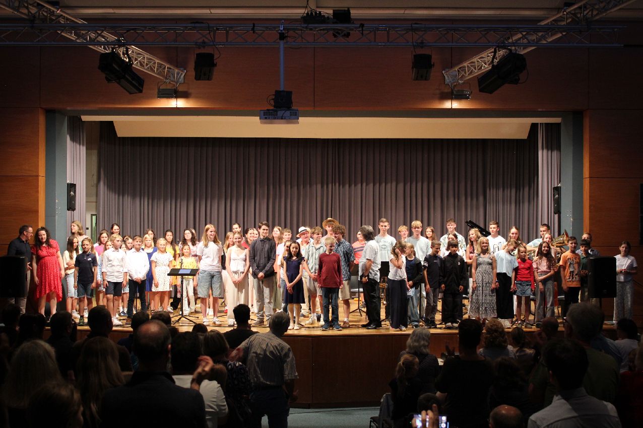 SommerkonzertUnter dem Motto „Hakuna Matata“, bekannt aus „Der König der Löwen“, stand das diesjährige Sommerkonzert, das erste nach der Coronapause. Und dass die zahlreichen Besucher des Konzerts ihre Probleme wenigstens für kurze Zeit vergessen werden, das versprach Johannes Romer in seiner Begrüßung, der ein Novum folgte: Bevor die Musiklehrer*innen Stefanie Flaig, Mirjam Hauser, Thomas Kuhner und Johannes Romer die verschiedenen Gruppen dirigierend oder instrumental durch den Abend begleiteten, begrüßten sie selbst musikalisch die Gäste mit Billy Joels „For the longest time“. Das Klassenorchester der 5a begeisterte anschließend das Publikum mit „Dance Monkey“ dermaßen, dass der ganze Saal rhythmisch mitklatschte und tosend applaudierte. Danach betrat der Chor der 5. und 6. Klassen singend die Bühne. Vier Stücke, französisch, englisch, deutsch, Sommerkonzertwurden von den Schülerinnen und Schülern so beschwingt und federleicht vorgetragen, dass sich beim Publikum Sommergefühle einstellten. Danach setzte sich Josephine Auber ans Klavier. Sie hatte beim diesjährigen Landeswettbewerb „Jugend musiziert“, dem höchsten Wettbewerb ihrer Altersklasse, die höchste Punktzahl erreicht und zeigte nun, warum. Mit dem Allegro und dem Andante von J.S.Bachs „Italienisches Konzert in F-Dur“ verzauberte sie das andächtig lauschende Publikum, dass von ihrem einfühlsamen Klavierspiel in den Bann gezogen wurde. Der Leistungskurs Musik der Jahrgangstufe 11 entfachte dann mit seinen drei Darbietungen die Sehnsucht nach Karibikstränden („A Coconut named Alex“), Streifzügen durch heimische Wälder („Das Wandern“) und die unbeschwerte Beatles-Zeit („Can´t buy me love“). Die gleiche Lebensfreude versprühte anschließend der Schulchor des Gymnasiums, der unterstützt wurde durch ein eigens hierfür zusammengestelltes Streicherquartett. Nachdem Coldplays „Viva la Vida“ verklungen war, leiteten die Big Band das Finale ein. Schon die Titel ihrer Stücke „Havanna“, „Smooth“ und „Happy“ zeigten die Stimmung an, die sie nun verbreitete. Dermaßen in Urlaubslaune versetzt, klatschte das Publikum begeistert mit, als die Big Band mit allen Chören des Abends „Hakuna Matata“ anstimmte. Mit Standing Ovations bedankten sich alle Gäste für diesen wundervollen Abend, der der perfekte Einstieg war für die anstehenden Sommerferien.