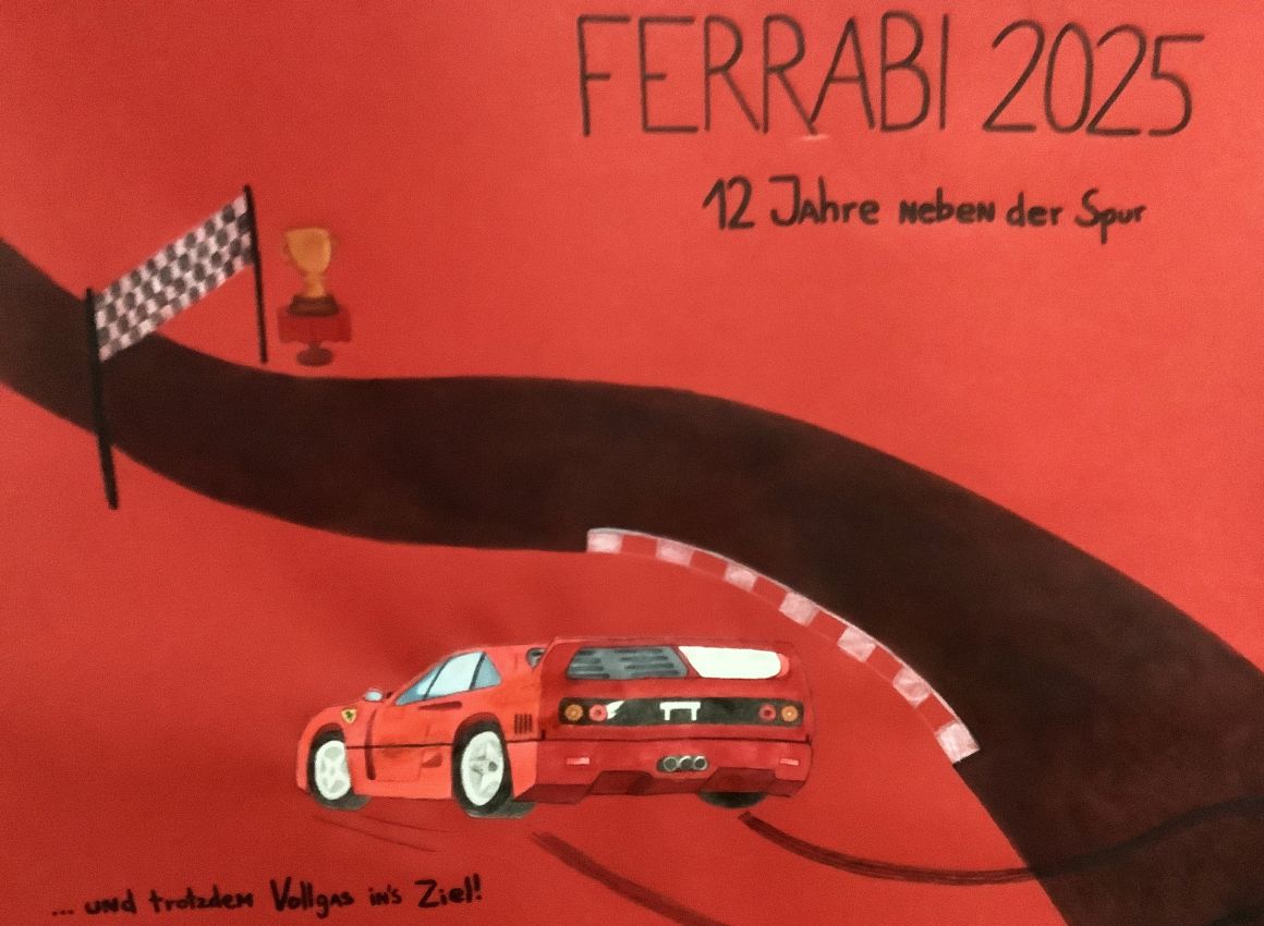 Abitur 2025Jetzt geht es für unsere Abiturienten unter dem Abimotto „Ferrabi – 12 Jahre neben der Spur“ in die Schlussrunde, die mit dem Fach Deutsch eingeleitet worden ist. Begrüßt von aufmunternden Plakaten am Aulaeingang stellten sich 39 Schülerinnen und Schüler des Leistungskurses zuerst der Herausforderung, bevor – nach dem verlängerten 1.Mai-Wochenende – alle anderen endlich auch durchstarten können. Insgesamt nehmen in diesem Jahr 77 Schülerinnen und Schüler am schriftlichen Finale teil, das erst am 21.Mai mit der letzten Prüfung im Fach Chemie endet. Die Praxisprüfungen im Fach Sport (Mannschaft) und Musik waren dem schriftlichen Abitur schon vorausgegangen, die Sportler müssen noch ein zweites Mal ran, gefolgt von den Kommunikationsprüfungen der Fremdsprachler, bis dann Anfang Juli die mündlichen Prüfungen die Schulzeit unserer Abiturienten beenden. Hoffen wir, dass alle über die Ziellinie kommen und am 12.Juli feierlich verabschiedet werden können.