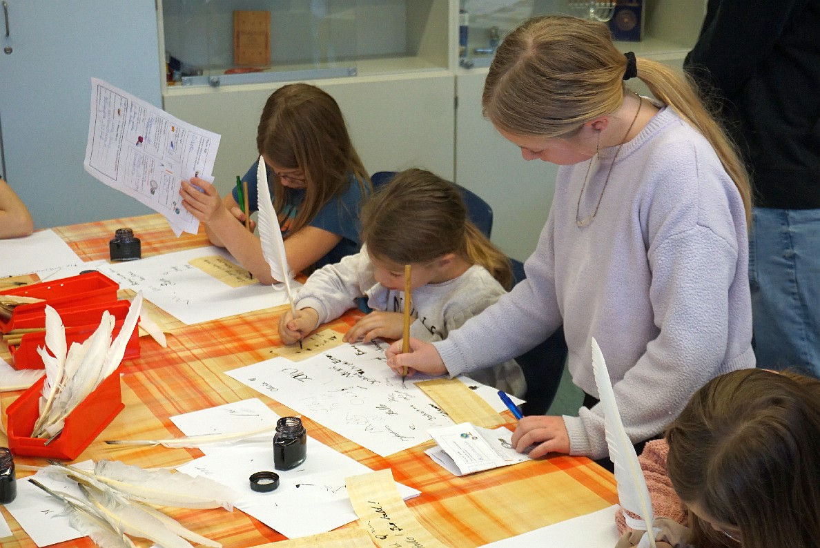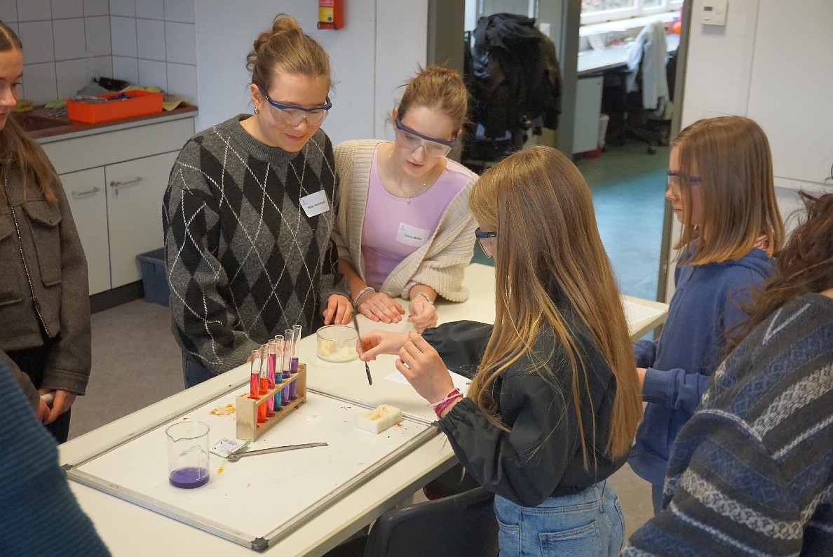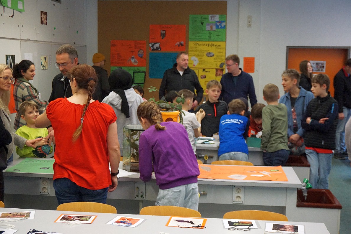 Im Anschluss konnten Kinder und Eltern unsere Schule auf eigene Faust erkunden. In vielen Klassen- und Fachräumen präsentierten sich die einzelnen Fächer mit spannenden Aktionen: So konnte man Experimente durchführen, Rätsel lösen, sich beim Basteln oder Malen kreativ betätigen oder in der Sporthalle herumtoben. Besonders große Augen gab es im Biologieraum: Frisch geschlüpfte Küken und seltsam anmutende Stabheuschrecken wurden schnell zum Highlight des Tages.
